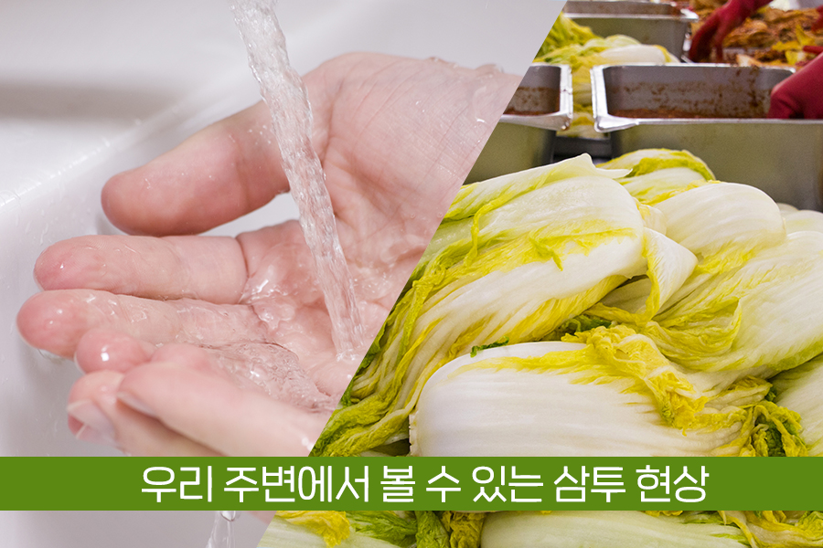 우리나라 대표 음식인 김치도 삼투압을 이용한 음식입니다! 배추를 소금물에 담가 물의 농도를 배추보다 높게 만들어 배추의 숨을 죽이는 건데요. 배추의 수분을 줄여 미생물이 번식하는 것을 막아 오래 보관하기 위한 방법입니다.