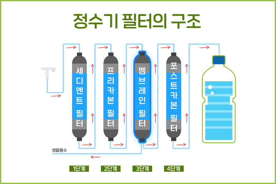 우선 여러 종류의 찌꺼기 등을 걸러주는 역할인 세디멘트 필터를 거쳐 프리카본 필터에서 소독냄새와 화학물질을 제거해 줍니다. 그리고 역삼투를 활용해 0.001~0.0001 마이크로 단위로 각종 세균과 중금속 걸러주는 멤브레인 필터를 거칩니다. 마지막으로 흡착의 성질을 이용해서 냄새를 제거하고 물맛을 좋게 하는 기능인 포스트카본 필터를 통해 우리가 마시는 정수기의 물이 완성됩니다.