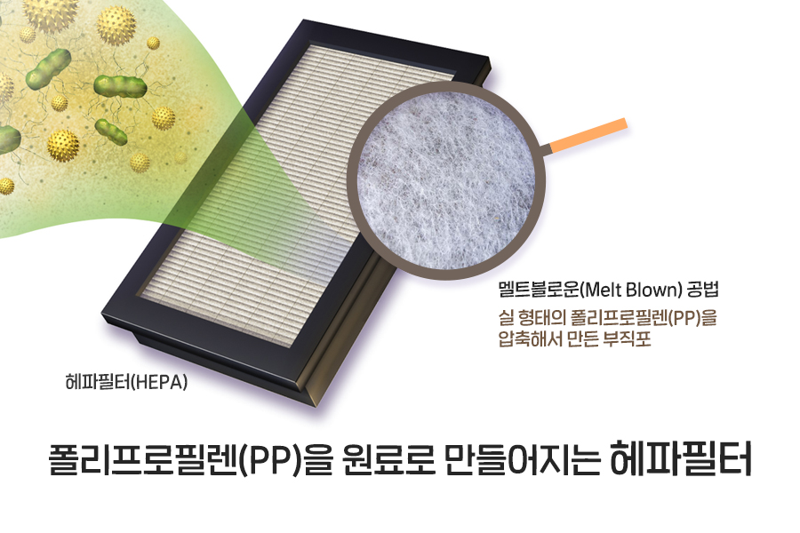 극도로 미세한 입자를 대부분 걸러낼 수 있는 고성능 필터를 의미하는 헤파필터는 고분자 소재인 폴리프로필렌(PP)을 원료로 멜트블로운(Melt Blown) 공법으로 만들어집니다. 멜트블로운(Melt Blown)은 녹여져 뿜는다는 뜻인데요, 폴리프로필렌(PP)에 열을 가해 녹인 다음, 노즐로 뿜어 실형태로 만든 뒤 압축해 부직포를 만드는 방법입니다. 이때 만들어진 부직포는 초극세 섬유로 유연하고 부드러우며 여과성능이 매우 뛰어나답니다. 그래서 무려 0.3㎛의 입자를 통과시켰을 때도 99% 이상 제거가 가능하다는 사실! 놀랍죠.