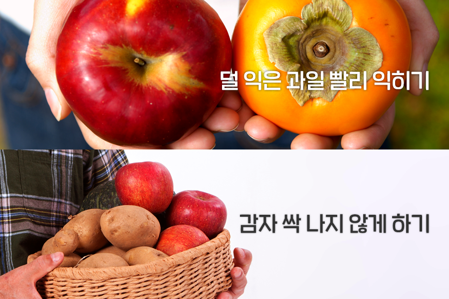 이 에틸렌은 사과, 감, 바나나, 멜론, 오렌지 등 덜 익은 상태로 수확한 과일을 익히는데도 쓰입니다. 추숙이란 수확기에 농작물이 저절로 떨어지는 것을 막기 위하여 일찍 거두어들인 다음 완전히 익히는 것을 말하는데요. 추숙의 속도는 보관장소의 온도, 에틸렌 가스의 양에 따라 좌우된다고 합니다.