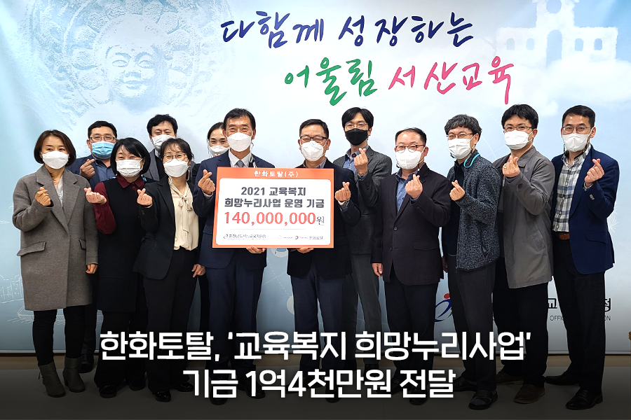 한화토탈은 또한, 지난 24일 충청남도서산교육지원청에 ‘교육복지 희망누리사업’ 운영 기금으로 1억 4천만 원을 전달했습니다. 해당 기금은 서산시의 저소득가정 학생들이 학교생활을 하는 데 필요한 동아리 활동비, 의료비, 긴급 생활비 등을 지원하는데 운영될 예정입니다.