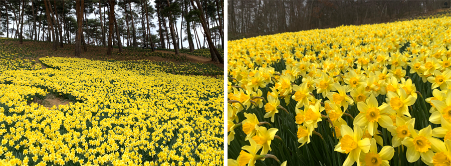 가옥 뒤편의 야트막한 산에는 본격적으로 수선화 꽃 군락이 펼쳐져 있습니다. 햇볕이 잘 드는 곳은 벌써부터 수선화 꽃이 활짝 피어 관람객들의 눈을 사로잡았는데요. 꽃밭에는 나무 밑동이나 벤치 의자, 빈 땅을 둬 ‘인생사진’을 남길 수 있도록 신경 써서 가꾼 모습이 곳곳에 보였습니다.