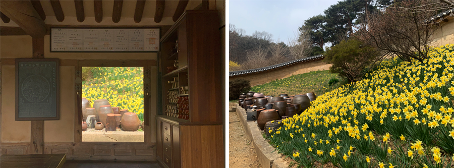 본격적으로 유기방가옥을 둘러볼까요? 중간에 위치한 유기방가옥을 둘러싸고 수선화 꽃밭이 넓게 펼쳐져 있는데요. 유기방가옥 안에 들어가 고택을 둘러보다 보면 문틀 너머 보이는 뒤뜰의 수선화와 장독대가 한 폭의 그림처럼 놓여 있는 모습에 발길을 멈추게 됩니다. 방문객들이 이 모습을 사진으로 담기 위해 줄 서 있는 모습도 심심치 않게 볼 수 있습니다.