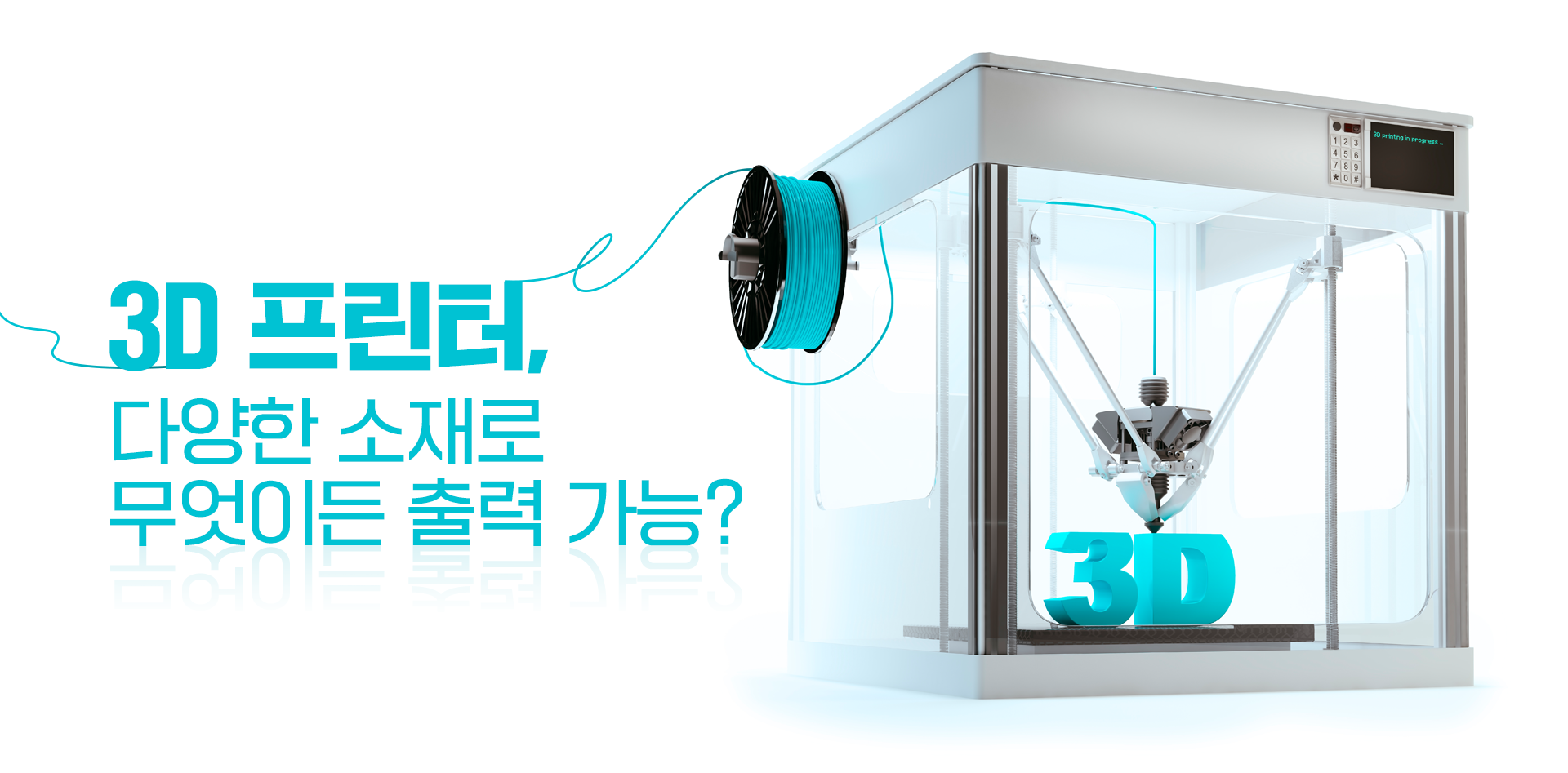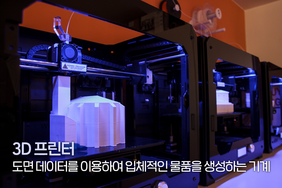 기존의 프린터는 컴퓨터의 문서나 이미지를 종이와 같은 2차원적인 평면에 인쇄하는 장치였는데요. 3D 프린터는 도면 데이터를 이용하여 2차원을 넘어 3차원의 공간에 입체적인 물품을 생성하는 기계입니다.