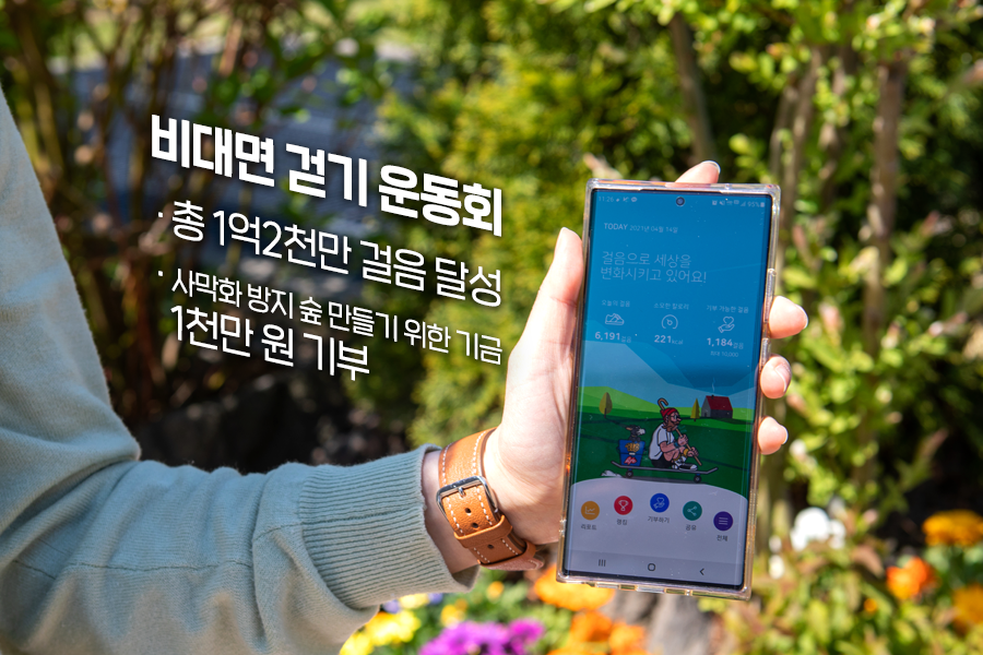 지난 3월 한 달간 한화토탈은 모바일 애플리케이션 ‘빅워크’를 활용한 ‘비대면 걷기 운동회’ 프로젝트를 진행했습니다. 임직원들의 걸음 수 총합이 1억 걸음을 돌파하면 사막화 방지 숲을 만들기 위한 기금 1천만 원을 국제 환경보호 단체인 ‘푸른아시아’에 기부하기로 했답니다.
