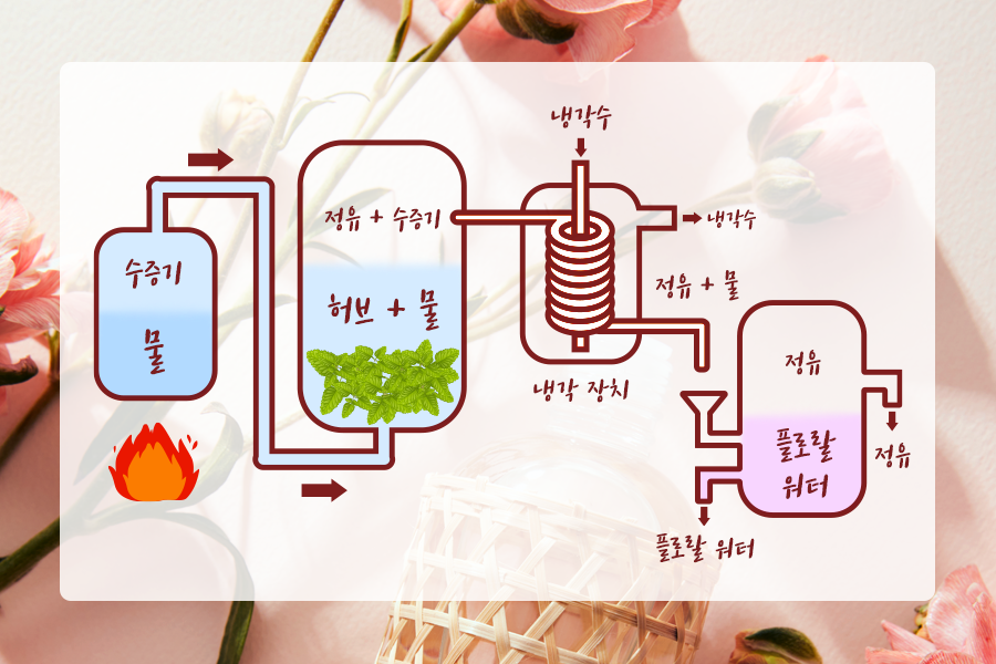 꽃이나 허브와 같은 원재료에서 향수의 원료가 되는 정유(식물의 잎, 줄기, 열매, 꽃, 뿌리 따위에서 채취한 향기로운 휘발성의 기름)를 추출하는 방법으로는 수증기 증류법이 있습니다. 수증기 증류법은 10세기경 아랍에서 개발되었고, 현재는 가압수증기 증류법으로 발전되어 가장 많이 사용됩니다.