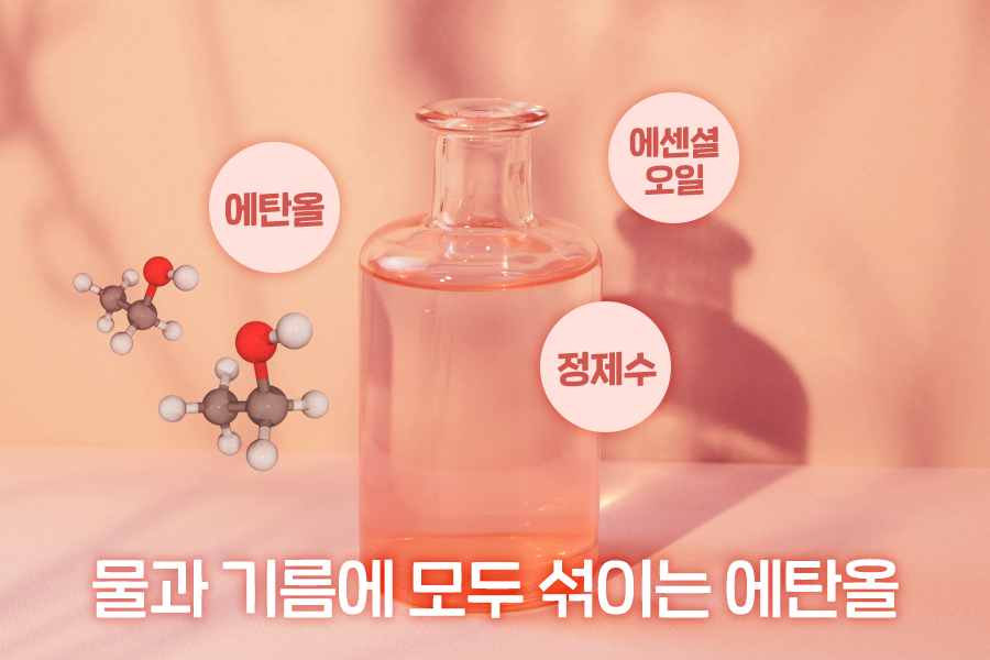 여기서 에탄올(C2H5OH)은 친수성기를 가진 극성 용매인데요. ‘친수성기’는 물과의 친화성이 강한 극성이 있는 원자단을 부르는 용어입니다. 친수성기를 가진 화합물은 물뿐만 아니라 다른 극성 용매에도 잘 녹는다는 특징이 있는데요. 향수는 물과 기름 모두에 섞이는 에탄올의 성질을 잘 이용하여 만든 것입니다.