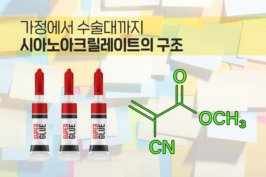 시아노아크릴레이트 접착제는 상온에서는 저분자의 액상 상태로 있다가 수분을 만나 중합반응을 하게 되면 분자들끼리 결합하여 고분자인 고체 상태의 폴리시아노아크릴레이트가 됩니다. 순간접착제는 시아노아크릴레이트가 주 성분으로 사용되고 있으며 유리, 플라스틱은 물론 금속 소재까지 모든 물질을 순식간에 영구적으로 붙일 수 있습니다. 또한 공업용, 가정용뿐만 아니라 의학용으로도 사용됩니다. 그중에서도 2-옥틸사이아노아크릴레이트(2-octyl cyanoacrylate)와 관련된 접착제는 의학용으로 상처를 봉합하는 데 사용되었습니다. 이는 더마본드를 비롯한 실제 수술에서 사용되는 의료용 접착제로 이용되고 있습니다.