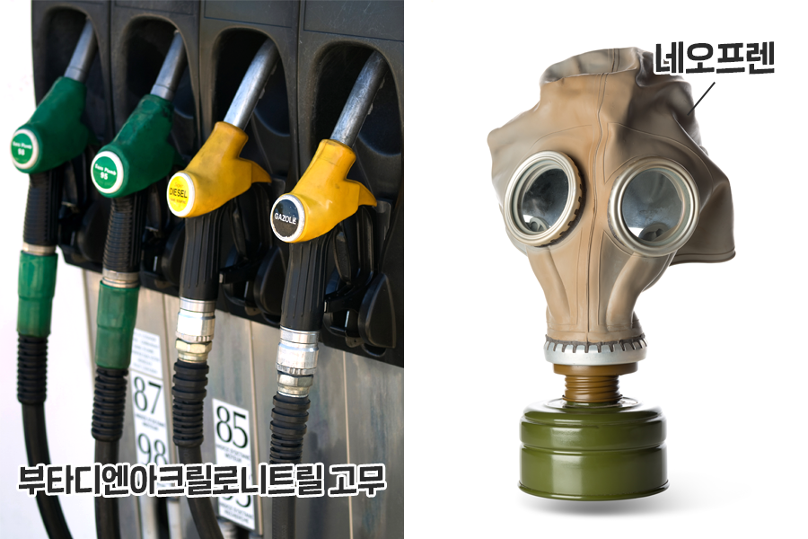 천연고무보다 뛰어난 성질을 가진 합성고무에는 ‘부타디엔아크릴로니트릴 고무’와 ‘네오프렌’ 등이 있습니다.
