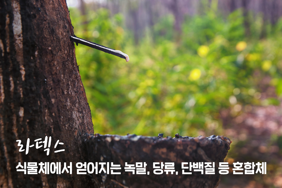 천연고무는 주로 파라고무나무의 수액에서 얻을 수 있는데요. 나무에 흠집을 내면 나오는 흰색 수액을 채취하여 고무의 원료로 사용합니다. 파라고무나무에서 나오는 유액은 우리가 잘 알고 있는 라텍스(latex)로 불리는데, 라텍스는 천연고무를 포함하여 식물체에서 얻어지는 녹말, 당류, 단백질 등 다양한 물질의 혼합체를 뜻합니다.