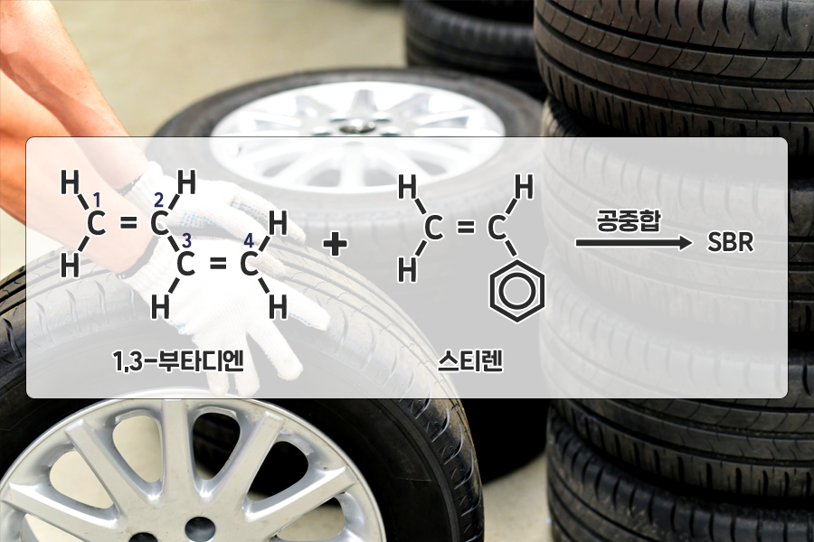 먼저, 천연고무와 거의 같은 용도로 이용되는 합성고무에는 흔히 SBR이라고 불리는 ‘부타디엔스티렌 고무’가 있습니다. 부타디엔스티렌 고무는 불포화탄화수소* 부타디엔(Butadiene·C4H6)과 스티렌(Styrene·C8H8)의 혼성 중합에 의해 만들어지는데요. 부타디엔스티렌 고무는 내노화성, 내열성, 내마모성 등이 우수하며 승용차 타이어, 호스, 벨트 등에 사용됩니다.