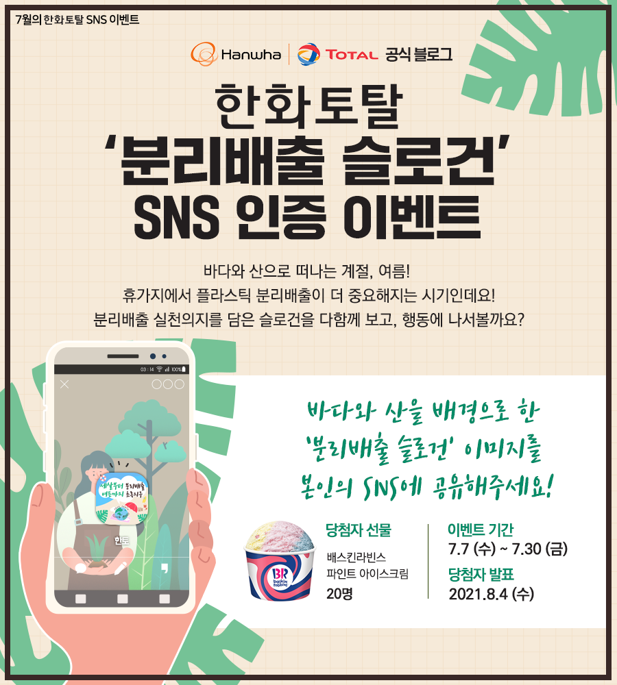 | ① 이벤트 참여 STEP 1 한화토탈 인스타그램(@hanwhatotal_insta)에 올라온 ‘에코더하기 슬로건’ 이미지를 본인의 계정에 리그램하거나, 한화토탈 페이스북(@ilovehanwhatotal)에 올라온 ‘에코더하기 슬로건’ 이미지를 공유한 뒤, ※ 인스타그램 이벤트 페이지 → https://bit.ly/3dN4OFS ※ 페이스북 이벤트 페이지 → https://bit.ly/3yxHALw ② 이벤트 참여 STEP 2 아래에 있는 네이버폼 주소에 참여 인증과 정보를 남겨주세요! ※ 이벤트 참여 인증 네이버폼 → http://naver.me/GeWTJuwZ 추첨을 통해 배스킨라빈스 파인트 아이스크림을 20분께 선물로 드립니다. |