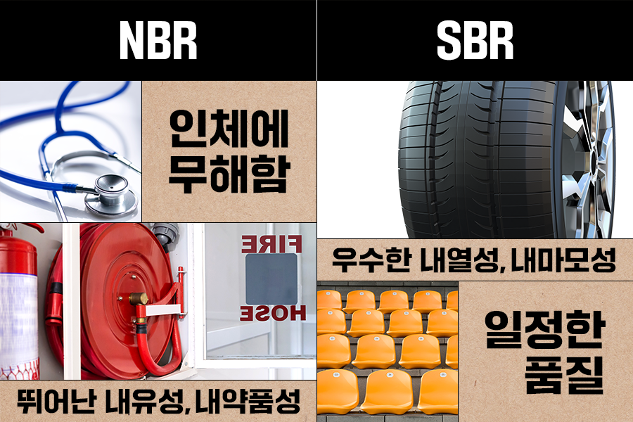 NBR, SBR 등의 합성고무가 이처럼 많은 쓰임새를 가진 이유는 천연고무에 비해 기능성이 뛰어나기 때문인데요. NBR의 경우, 내유성과 내약품성이 뛰어나 코로나 확산 이후 특히 많은 각광을 받고 있습니다. 또한 SBR은 품질이 일정하고, 내열성과 내마모성이 우수한 장점이 있습니다.