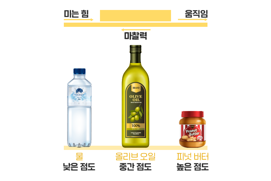 식탁 위에 있는 물, 올리브오일, 땅콩버터 이 세 물질을 비교해볼까요? 물은 용기에 따라 모양이 잘 변하고 흘러내리는 반면, 올리브오일은 물보다는 끈적하니 흐름성이 떨어집니다. 땅콩버터는 나이프로 힘을 주어 펴 발라야 하고, 빵에 발린 이후에는 흐르지 않고 형태를 유지하고 있고요. 쉽게 말해 물, 올리브오일, 땅콩버터 순으로 변화를 주기 위해 필요한 힘이 커지는 거죠!
