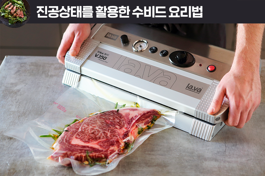 수비드 조리를 위해 진공포장하면 육류의 경우, 식육과 산소의 접촉이 줄고, 지방산의 변화가 적게 나타나기 때문에 산화 억제가 가능하단 장점이 있습니다.
