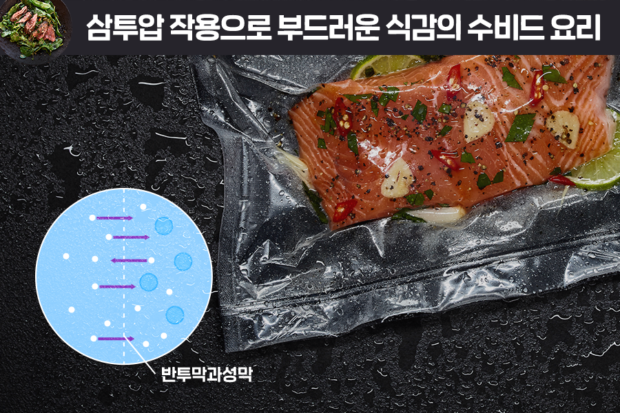 그렇다면 수비드 조리법에서 삼투압은 어떻게 작용될까요? 바로, 고기의 육즙이 빠져나가는 대신, 삼투압을 거쳐 재료에 다시 배어들게 된답니다. 식재료에 있는 수분은 조리 과정 중에서 처음에 재료 밖으로 빠져나가는데요. 식재료가 진공포장돼있기 때문에, 수분은 상대적으로 농도가 높은 식재료 안으로 다시 들어가게 됩니다. 이렇게 오랜 시간 조리하게 되면 부드러운 식감은 유지한 채, 재료의 풍미를 더욱 풍부하게 음미할 수 있습니다.