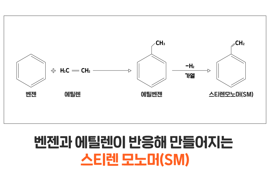 스티렌모노머(SM)는 벤젠과 에틸렌을 합성해 중간물질인 에틸벤젠(ethylbenzene)을 만든 다음 가열해 만들어지는데요. SM은 스티로폼으로 익숙한 폴리스티렌(PS)부터, 대표적인 합성고무인 SBR, 내열성과 내충격성이 뛰어난 플라스틱인 ABS 등을 만드는 데 사용되는 기초유분 입니다.