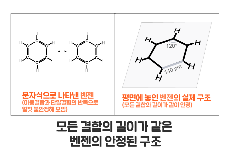 방향족 화합물의 기본 틀을 이루는 벤젠은 안정된 육각형 탄소 고리 구조를 갖는데요. 벤젠 분자식은 일반적으로 육각형 고리에 이중결합과 단일결합이 번갈아 있는 모양으로 표현합니다. 이중결합은 반응성이 높다고 알려져 있기에, 벤젠이 안정된 구조를 갖고 있다는 말이 이상하게 들릴 수 있는데요. 사실, 실제 벤젠에서 탄소 원자는 평면 상에서 이중결합(2)도 단일결합(1)도 아닌, 중간 정도의 결합(1.5)으로 이어져 있어 모든 결합의 길이가 같습니다! 이를 ‘공명 구조(resonance structure)’라고 하는데요. 공명 구조를 갖는 벤젠은 반응성이 높은 이중결합이 분자에 실제로 없기 때문에 안정성을 갖게 된답니다.
