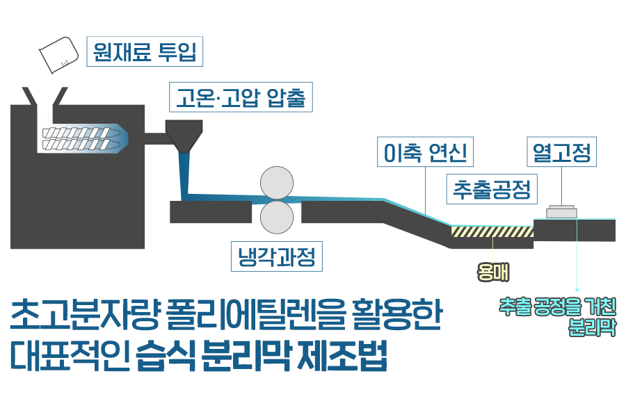 초고분자량 폴리에틸렌이 실제로 어떻게 배터리 분리막으로 만들어질까요? 분리막은 다공성(porous) 구조를 만드는 제조법에 따라 연신 공정을 기반으로 한 건식 분리막과 추출 공정을 기반으로 한 습식 분리막으로 나눌 수 있는데요. 초고분자량 폴리에틸렌은 습식 분리막의 원재료로 사용됩니다.