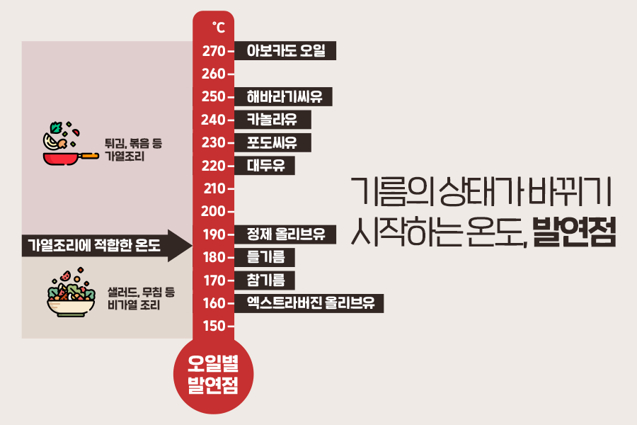 튀김은 기름을 사용하는 대표적인 요리라고 해도 과언이 아닌데요. 기름을 사용하는 요리에서는 조리하는 음식에 따라 알맞은 기름을 사용하는 것이 매우 중요합니다. 이는 사용하는 기름의 종류마다 발연점이 다르기 때문인데요. 발연점은 말 그대로 연기가 지속적으로 피어오르는 온도를 말합니다. 기름이 타기 시작하고, 조리하는 식품에서 탄 맛이 나며, 기름의 영양소가 파괴되는 온도입니다. 그래서 발연점을 고려해 용도에 적합한 식용유를 잘 알고 사용해야 합니다.