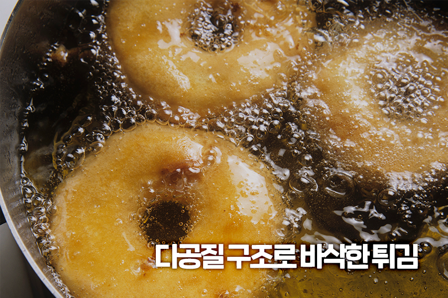 튀김옷에 있던 수분이 빠져나가면서 기체로 바뀌면 튀김옷 곳곳에는 구멍이 생겨나는데요. 스펀지처럼 구멍이 생긴 이 입체 구조를 다공질 구조라고 합니다. 다공질 구조의 특징 중 하나는 바로 쉽게 붕괴된다는 점인데요. 우리가 튀김을 입에 넣고 씹었을 때 바삭거리는 식감을 즐길 수 있는 이유는 바로 이 다공질 구조가 부서지기 때문입니다.