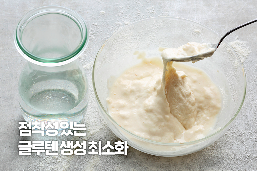 맛있는 튀김의 생명은 얇고 바삭한 튀김옷이죠! 그 비법은 글루텐을 줄이는 것에 있습니다. 글루텐은 밀가루에 들어 있는 글리아딘과 글루테닌이 혼합하여 물과 섞이며 생겨나는 점착성 있는 덩어리입니다. 글루텐이 너무 많으면 반죽에 점성이 생기기 때문에 바삭함이 떨어지는데요. 따라서 바삭함이 생명인 튀김의 반죽을 만들 때는 글루텐 생성을 최소화하는 것이 중요합니다.