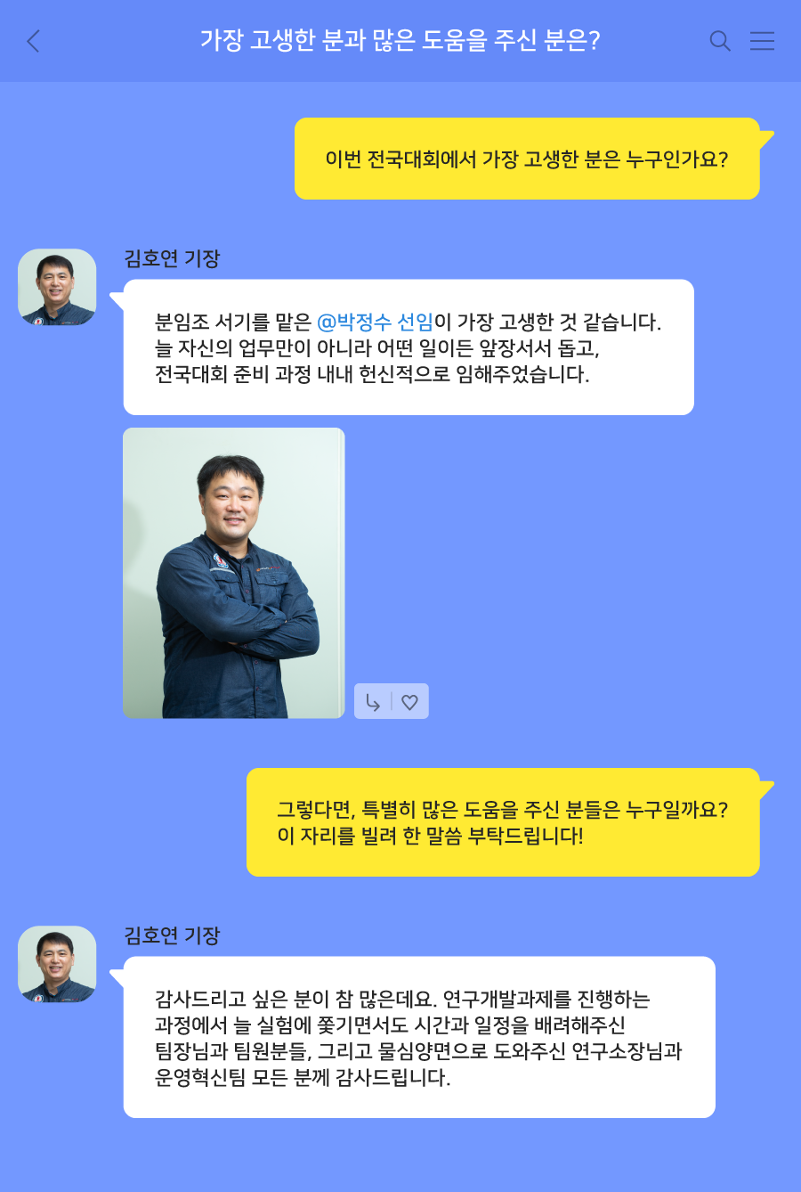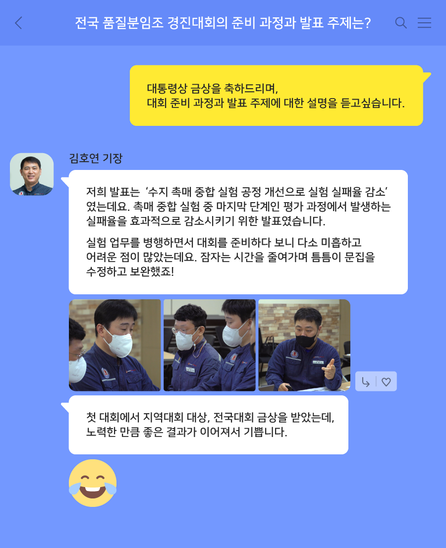 감사드리고 싶은 분이 참 많은데요. 연구개발과제를 진행하는 과정에서 늘 실험에 쫓기면서도 시간과 일정을 배려해 주신 팀장님과 팀원분들, 그리고 물심양면으로 도와주신 연구소장님과 운영혁신팀 모든 분께 감사드립니다. 앞으로도 창의적인 발상으로 우리 회사 촉매 연구 발전에 도움이 되는 분임조가 되겠습니다.