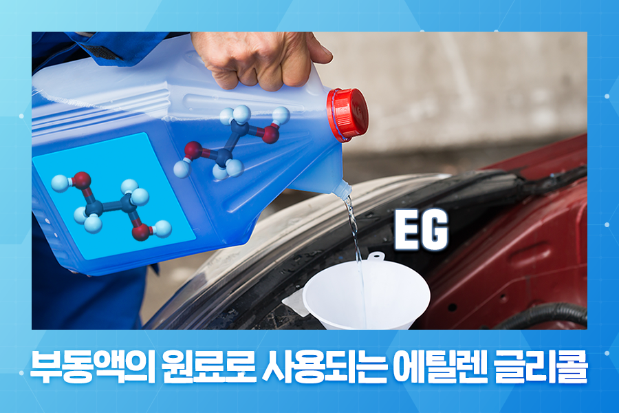에틸렌 글리콜(EG)은 부동액의 원료로 흔히 사용되는 물질입니다. 에틸렌 글리콜(EG)과 물을 섞으면 혼합 비율에 따라 어는 점이 영하 50℃까지 낮아지는데요. 이런 특징을 이용해 부동액의 원료로 사용하는 거죠. 에틸렌 글리콜에 대해 더 자세히 알고 싶다면 아래 글을 더 참고해주세요.