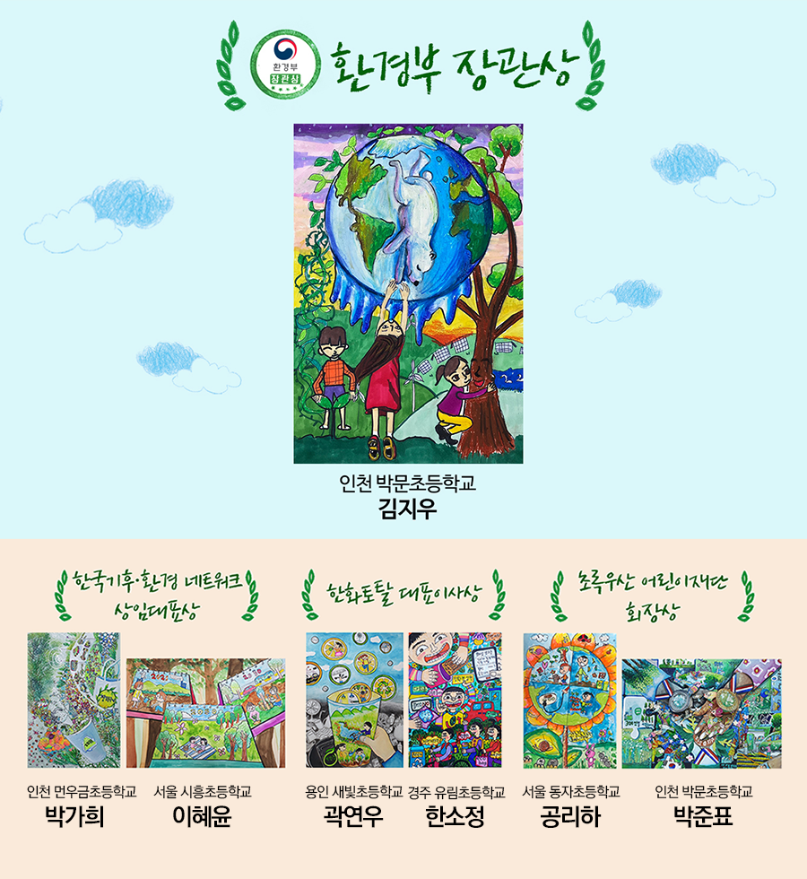 환경부 장관상을 수상한 김지우 학생은 “지구 온난화로 북극곰을 비롯해 많은 동물들이 생존의 위협과 멸종 위기에 처해있다는 뉴스를 접하고 마음이 너무 아팠다. 이런 동물들의 아픔을 달래주고 싶은 마음을 담아 그림을 그렸다”며 “이제부터 양치질할 때 컵을 사용하거나 TV시청이나 핸드폰 사용시간을 줄여 에너지를 절약하며 지구를 보호하기 위해 노력하겠다”고 수상 소감을 밝혔습니다.