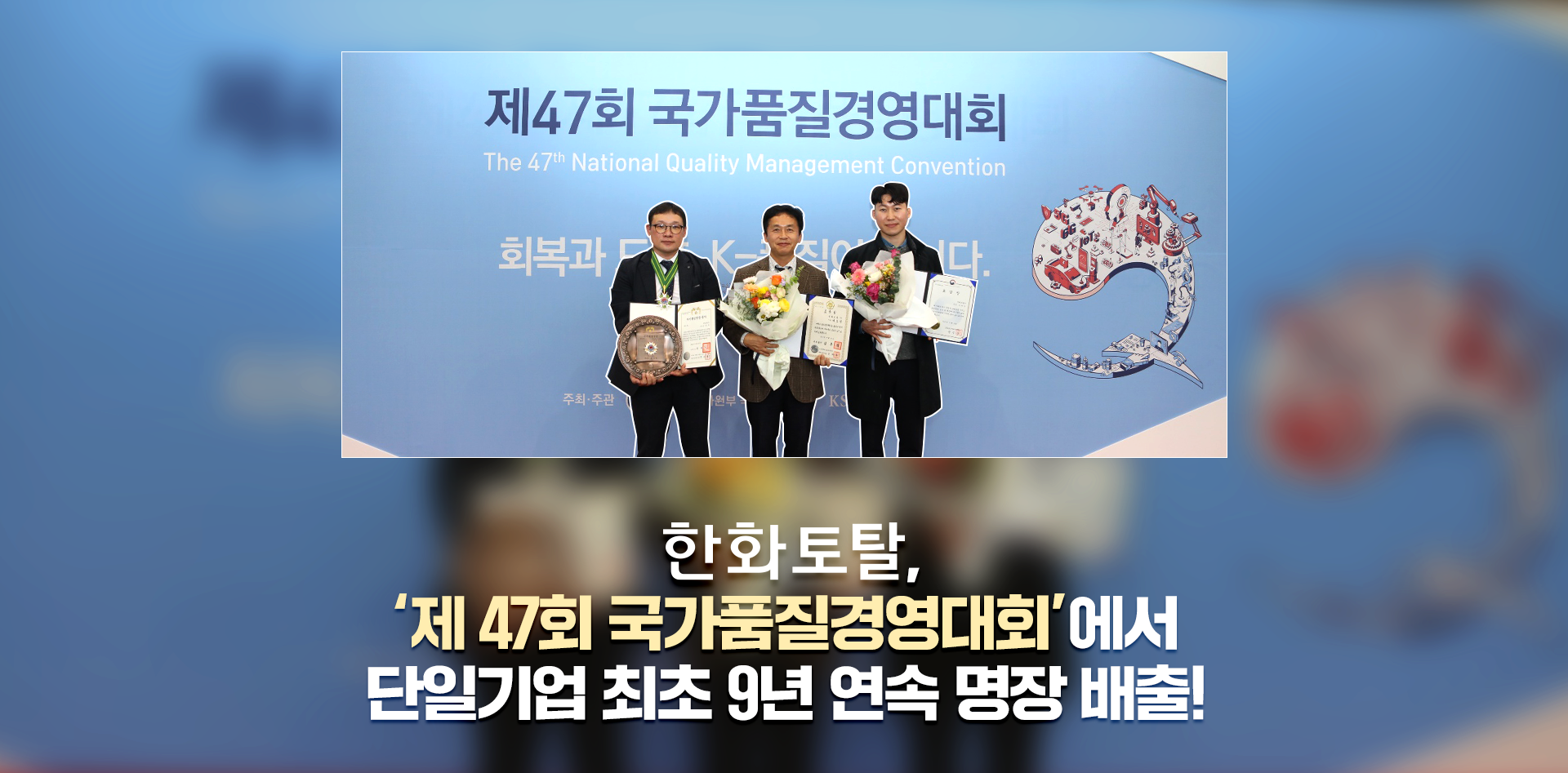 안녕하세요, 한화토탈 블로그 지기입니다. 한화토탈이 올해 열린 ‘제 47회 국가품질경영대회’에서 국가품질명장을 배출해 9년 연속 명장 배출이라는 자랑스러운 행보를 이어가고 있다는 소식입니다!