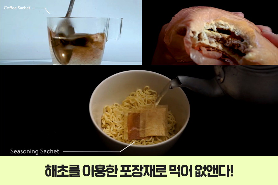 식용이 가능한 이 포장재는 라면수프나 인스턴트커피 등 열기와 습기에 약해도 괜찮은 제품에 쓰인다고 합니다. 뜨거운 물과 함께 녹여 먹을 수 있는 것이죠. 정말 기발한 아이디어이지 않나요? 이밖에 햄버거 포장지로도 사용된답니다.