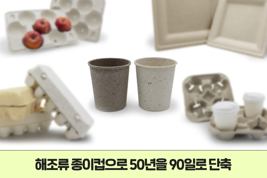 해조류 종이컵은 특정 해조류의 부산물 중, 알긴산과 같이 펄프화를 할 수 있는 성분과 종이 펄프를 섞어, 물리적인 공법으로 만들어졌습니다. 기존 종이컵의 화학적 공정이 불필요하다는 장점이 있죠. 무엇보다, 기존의 종이컵은 비닐로 코팅돼 분해되는데 50년이 걸리는데, 해조류 컵은 90일 정도면 모두 분해된다고 합니다.