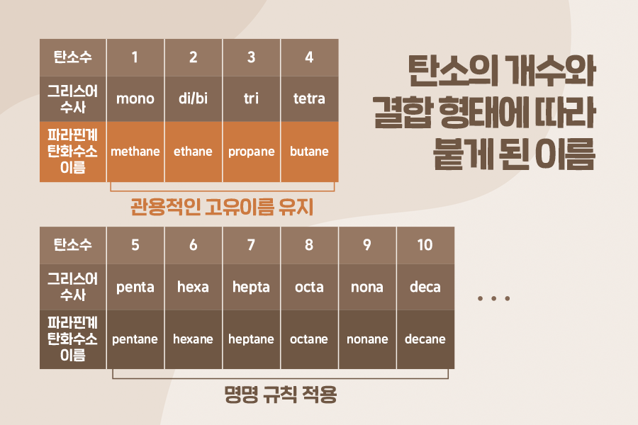 단, 탄소 원자수 1부터 4까지는 관용적으로 써오던 고유 이름을 사용하고, C5 이상부터 이 방식을 적용해 ‘펜탄, 헥산, 헵탄’ 등으로 불린답니다.