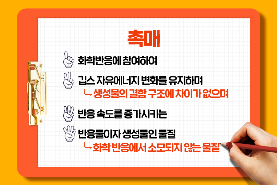 여러분의 이해를 돕기 위해 앞에서 알아본 촉매의 정의, “화학 반응에 참여하여 생성물의 결합구조에 차이가 없고 반응 속도를 증가시키며 화학 반응에서 소모되지 않는 물질”을 하나씩 해석해보겠습니다.