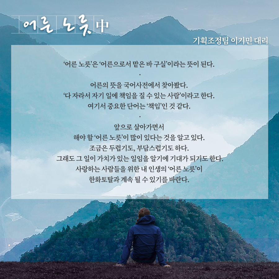 기획조정팀 이기민 대리의 <어른 노릇>이라는 글을 읽으니, ‘진정한 어른이란 무엇인가’에 대해 다시 한번 생각하게 되네요. 우리 모두 아직 미숙한 면이 있지만, 앞으로 ‘어른 노릇’이 필요한 순간마다 맡은 바를 다하여 성숙한 어른에 가까워질 수 있기를 바랍니다.