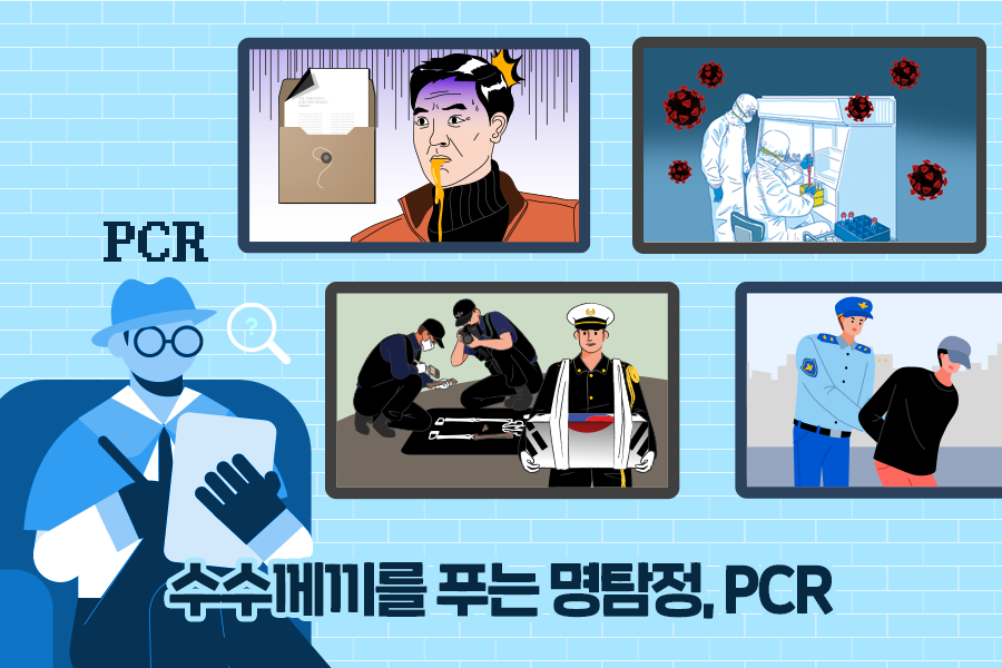 이렇듯 미스터리와 수수께끼가 있는 곳에서 비밀을 풀어내는 탐정의 역할을 하는 PCR의 공식 명칭은 ‘유전자증폭기술(Polymerase Chain Reaction)’ 입니다. 특정 DNA를 극소량만으로도 수만 배 이상 대량 증폭하는 기술을 말합니다. 유전자를 고온에서 이중나선으로 풀어, 낮은 온도에서 단계적인 중합반응*을 이끌어내므로 ‘유전자 중합효소 연쇄반응’이라고도 합니다.