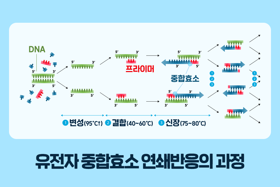 PCR은 변성(Denaturation)-결합(Annealing)-신장(Elongation)의 세 단계를 한 주기로 반복하게 되는데요, 하나씩 살펴보도록 하겠습니다. DNA는 기본적으로 이중나선구조로 이루어져 있는데 열을 가하면 두 가닥이 서로 떨어집니다. 이를 ‘변성’이라고 합니다. 분리된 각각의 가닥에 프라이머를 넣고 열을 내리면 프라이머가 DNA 가닥에 붙게 되는데 이 과정을 ‘결합’이라고 합니다. 여기에 중합효소를 넣고 온도를 다시 높여주면 프라이머가 붙은 위치에서부터 한 가닥으로 쭉 자라납니다. 이를 ‘신장’의 단계라고 합니다.