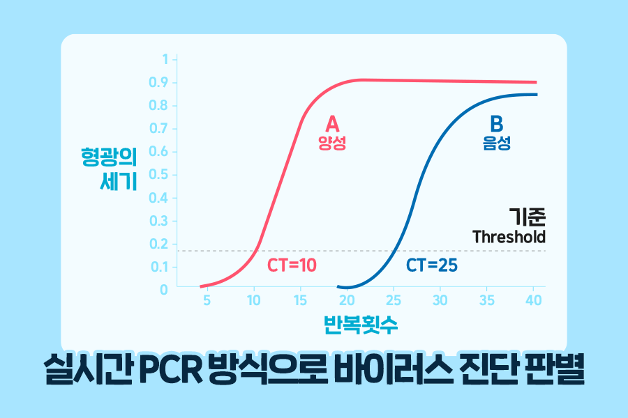 이때 특정 기준선을 중심으로 연쇄반응이 반복되는 횟수를 CT값(Cycle Threshold)라고 하는데, 위 그래프에서 A는 CT값이 10이고, B는 CT값이 25임을 알 수 있습니다. 이때 CT값이 적을수록 바이러스의 양이 많은 것인데요, 즉 유전자 증폭을 적게 해도 해당 바이러스의 유전자가 많이 검출되기 때문입니다. 어떠한 감염병 바이러스의 CT값이 16이라고 가정한다면 이보다 더 적은 CT값을 보유한 A는 양성, B는 음성 판정을 받게 됩니다.