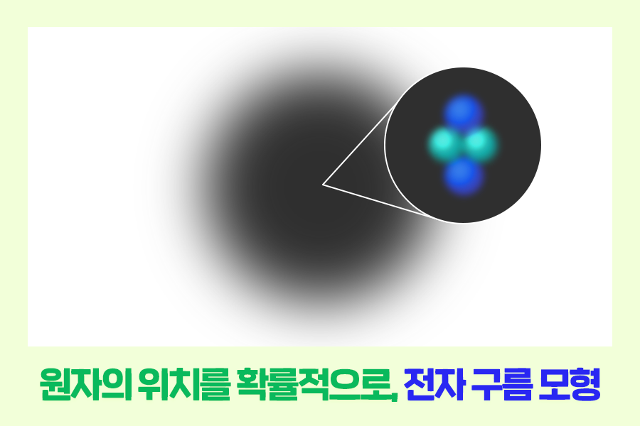 원자 주위에 있는 전자는 옮겨 다니기 때문에 그 위치를 정확하게 나타내는 것이 불가능 하고, 단지 확률적으로만 나타낼 수 있다는 것이 현대의 전자 구름 모형입니다. 따라서 앞선 모형과 같이 정확한 전자의 위치를 보여주지 않고 전자가 존재할 수 있는 확률을 보여주죠.