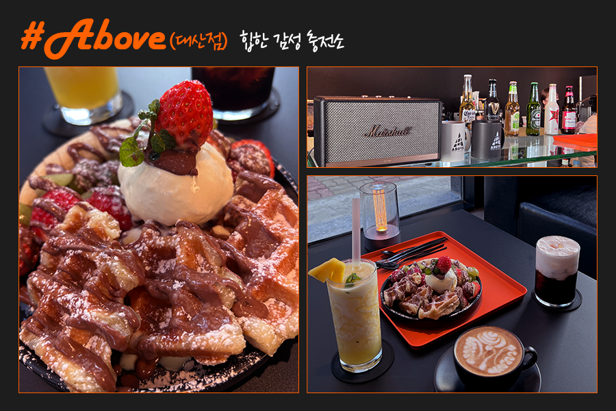 모던한 분위기와 블랙&오렌지의 포인트 컬러가 돋보이는 ‘카페 Above’는 대산에 상륙한지 얼마 되지 않은 따끈 따끈한 신상 카페입니다. 카페에 앉아 해질녘 풍경을 감상할 수 있는 카페였는데요, 널찍한 내부에는 포토존이 있어 인스타 피드를 업데이트하고 싶다면 포토존에서의 한 컷! 놓칠 수 없죠.