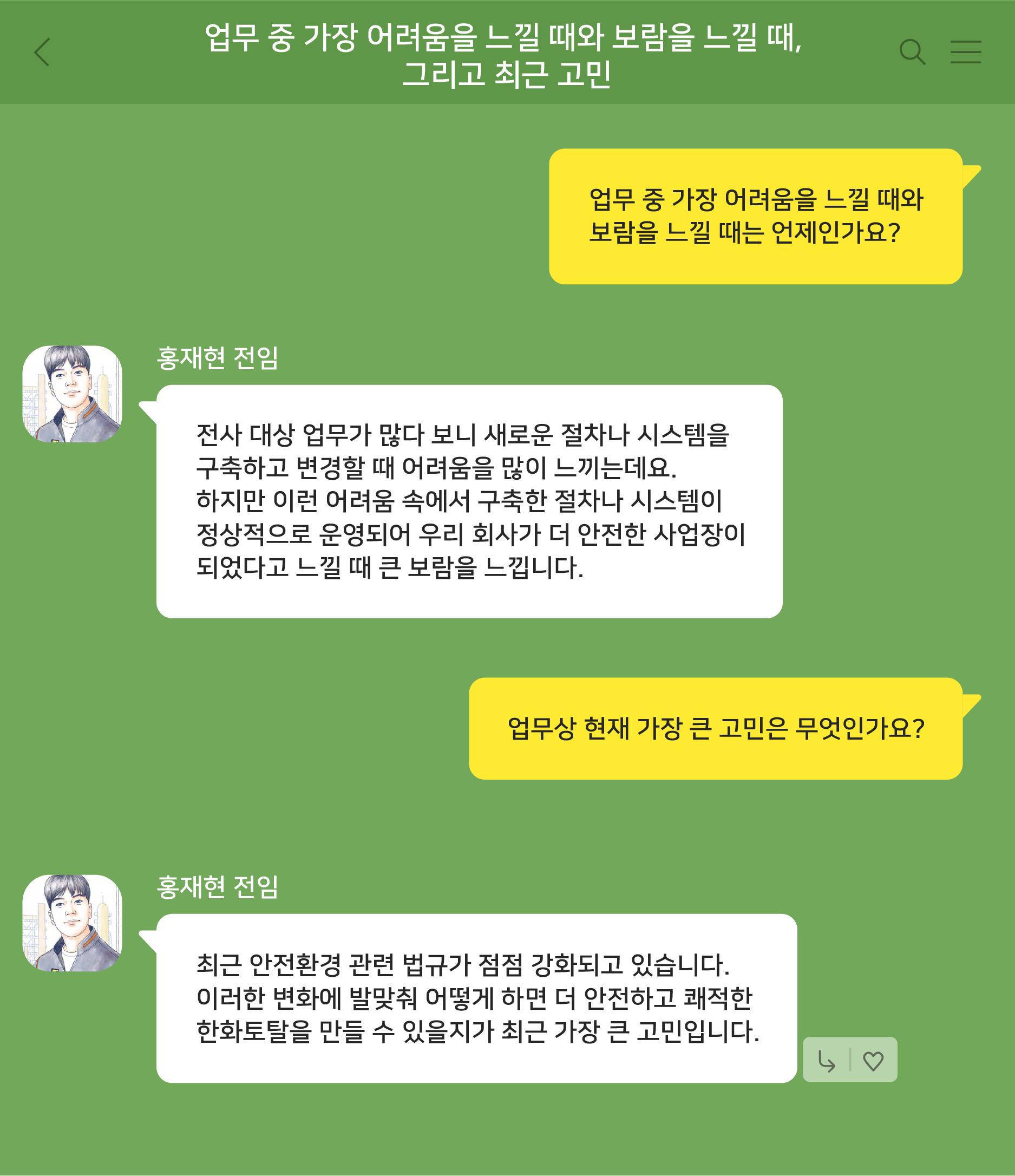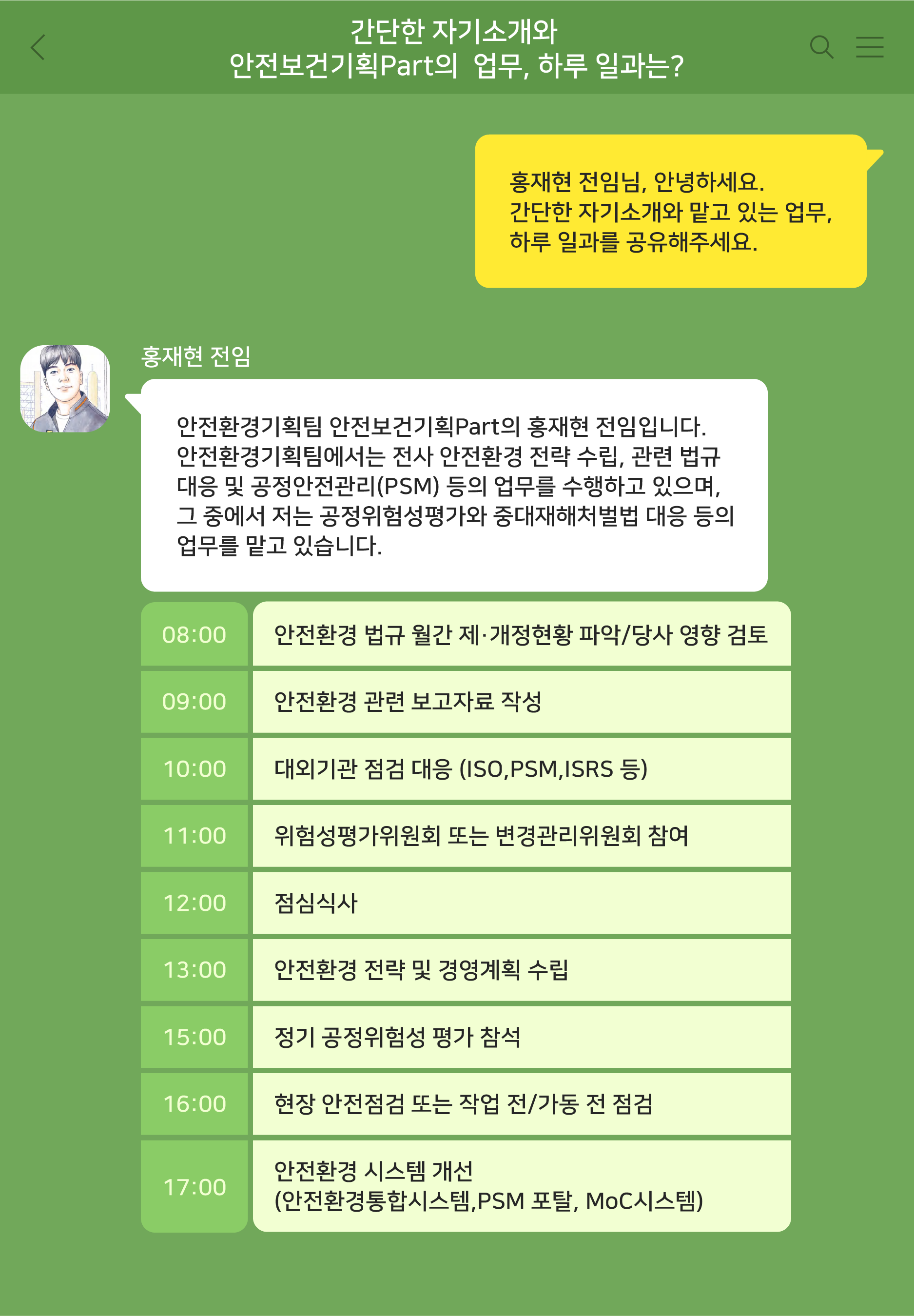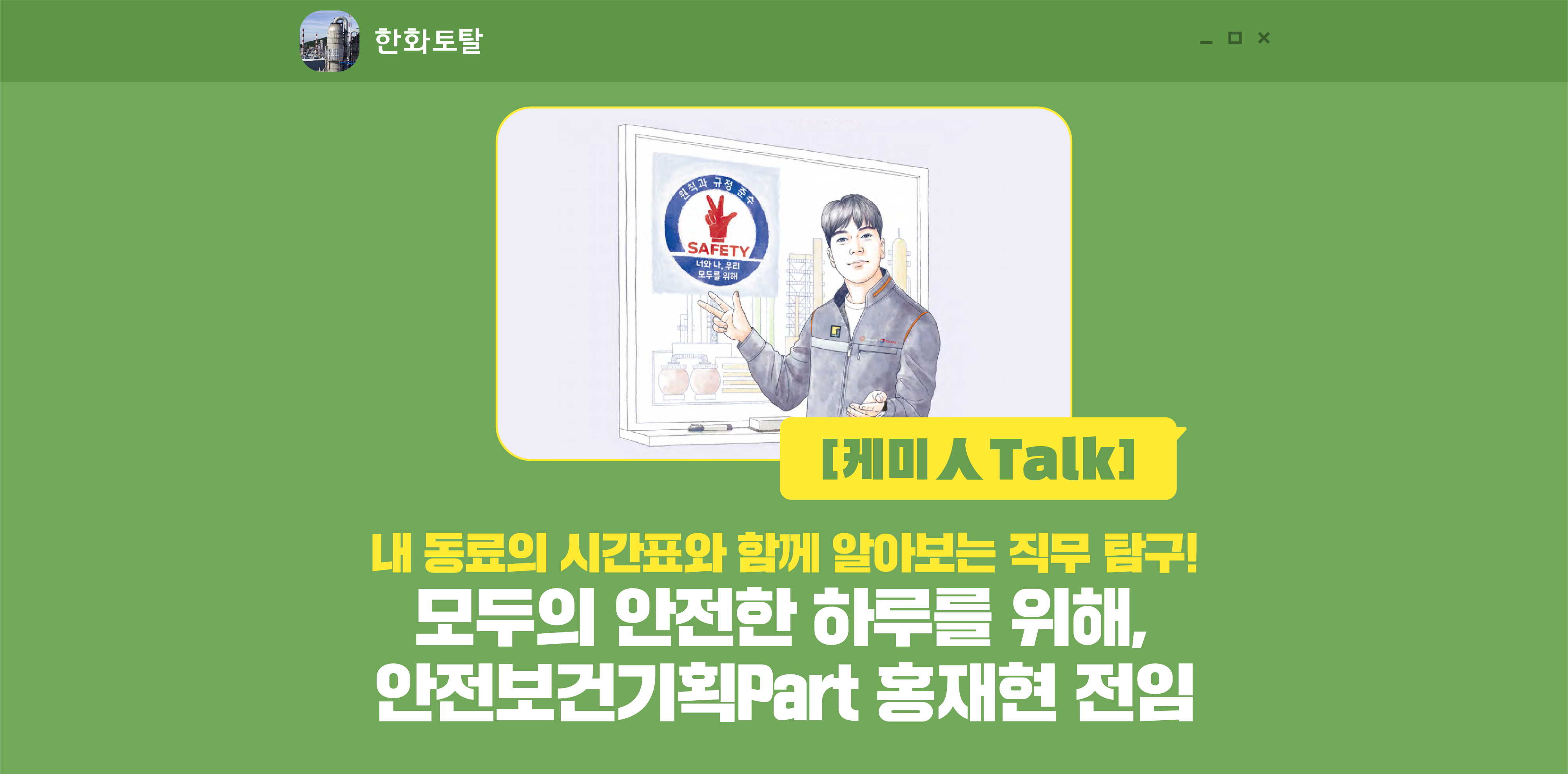 오늘은 한화토탈의 안전환경을 위해 고민하고 또 고민하는 안전보건기획Part, 홍재현 전임을 만나보았는데요. 홍재현 전임의 일과표과 인터뷰를 통해 안전보건기획Part와 더 가까워 진 것 같습니다. 그럼, 다음 케미人Talk도 기대해주세요.