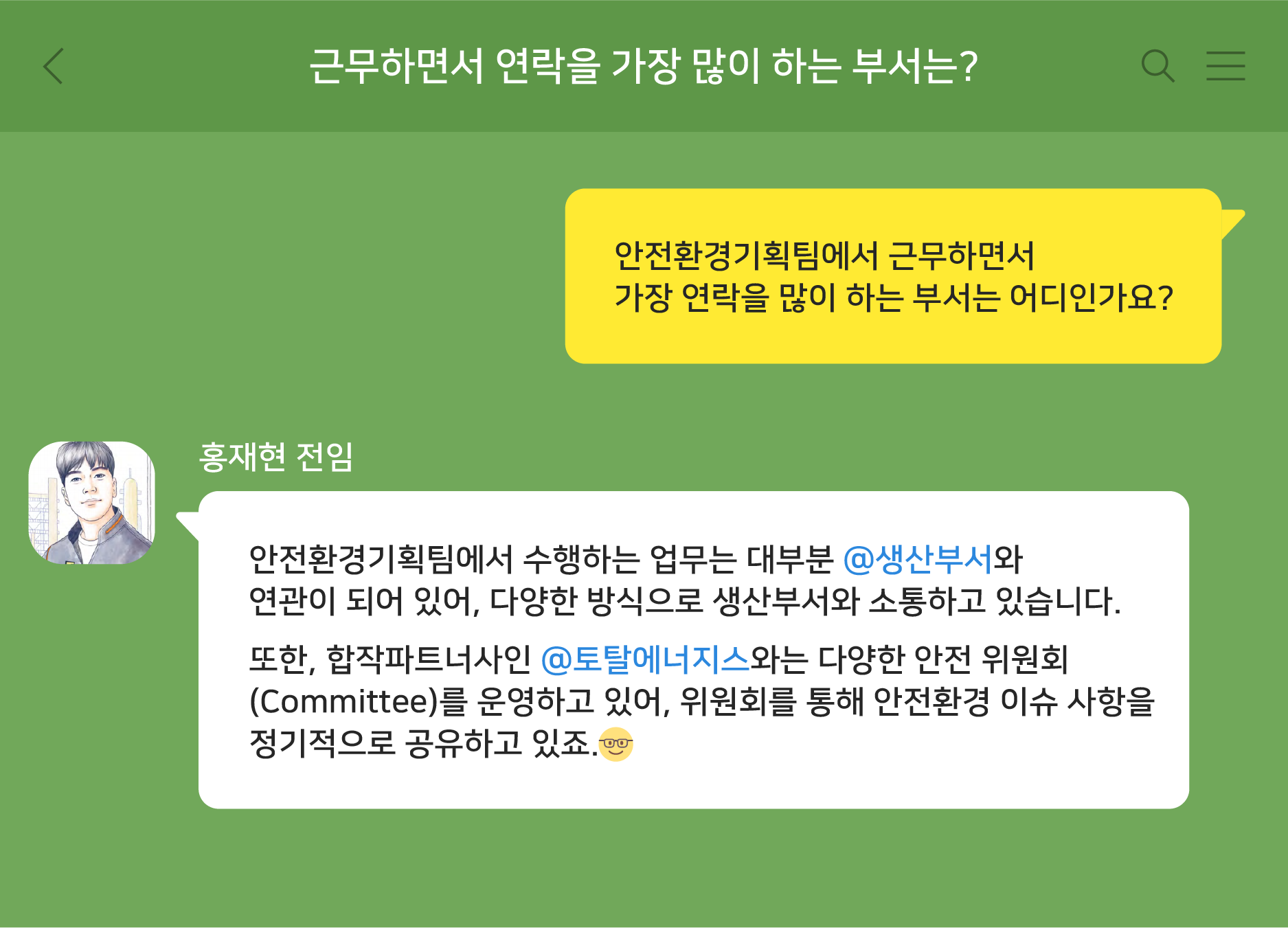 안전환경기획팀에서 수행하는 업무는 대부분 생산부서와 연관이 되어 있는데요. 그런 탓에 아무래도 생산부서와 협업이나 연락을 하는 일이 많은 것 같습니다.