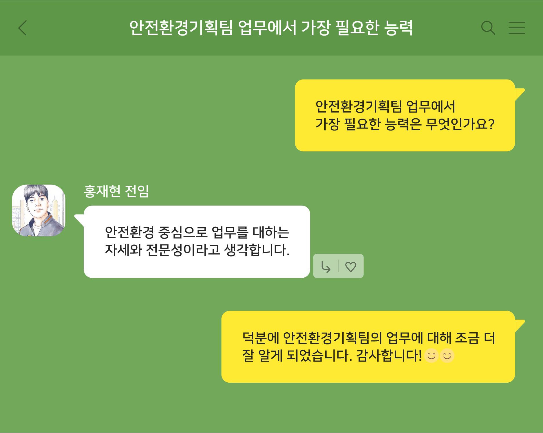 ‘안전환경을 중심으로 업무를 대하는 자세’와 ‘전문성’이라고 생각합니다. 어떤 업무를 하더라도 안전환경을 최우선으로 고려하며, 안전환경에 대한 전문성도 뒷받침된다면 안전환경기획팀에서 업무를 수행하는 데 큰 문제가 없지 않을까 싶습니다.