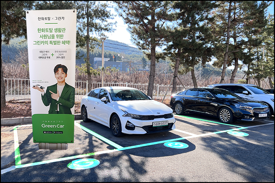 한화토탈 생활관에는 특히 이동수단을 위한 공간이 잘 마련되어 있는 것이 특징인데요. 자동차를 구입하기는 부담스럽지만 가끔 필요할 일이 생길 때 바로 이용할 수 있는 차량이 있다면 좋겠죠? 셔틀버스도 정해진 시간마다 운행되고 있지만 시간과 거리에 구애받지 않고 차를 이용하고 싶을 때는 카셰어링 서비스인 그린카를 이용할 수 있습니다. 그린카를 위해 별도로 할당된 주차공간이 있어서 필요한 때에 예약할 수 있고 한화토탈 직원들을 위해서 더욱 할인된 가격으로 이용 가능하답니다.