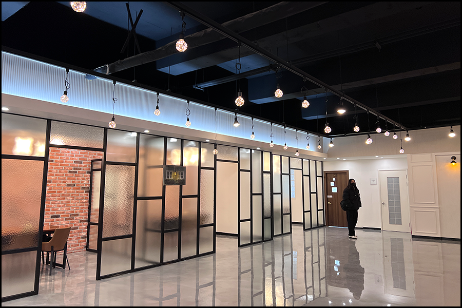 복지관의 지하로도 한번 내려가보겠습니다. 지하에는 여러 개의 문이 보이는데요, 문을 열면 완전히 새로운 공간이 펼쳐집니다. 둠칫둠칫. 심장을 울리는 비트 소리와 건반 소리가 들려 오는 이곳은 음악동호회실입니다. 왕년에 기타 좀 치고 노래 좀 부르셨던 분들의 못다 이룬 음악의 꿈을 꾸게 하는 이곳은 방음 시설이 잘 되어 있어서 마음껏 음악 본능을 일깨울 수 있는 곳입니다. 직원의 취미와 동아리 활동을 지원하기 위해 설치된 음악동호회실에는 밴드활동을 하기 위한 여러 악기와 품질 좋은 스피커, 악보대가 모두 갖춰져 있답니다.