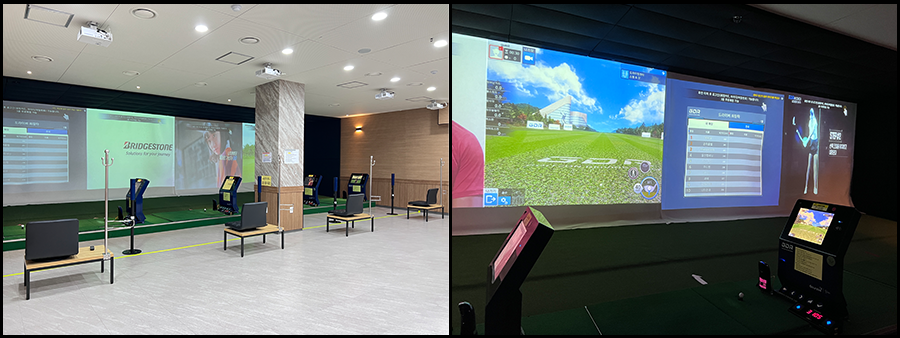 초록색 잔디가 펼쳐진 이 곳은 바로 스크린 골프 연습실입니다. 요즘 골프는 MZ세대 사이에서도 인기 스포츠로 떠오를 만큼 찾는 연령대의 폭이 더 넓어지고 있는데요, 골프를 이 곳 생활관에서도 즐길 수 있도록 마련되어 있어 골프에 갓 입문한 골린이부터 선수급 실력을 뽐내는 골프 마스터까지 수준별로 다양하게 즐길 수 있는 골프 연습 기구들이 있습니다.