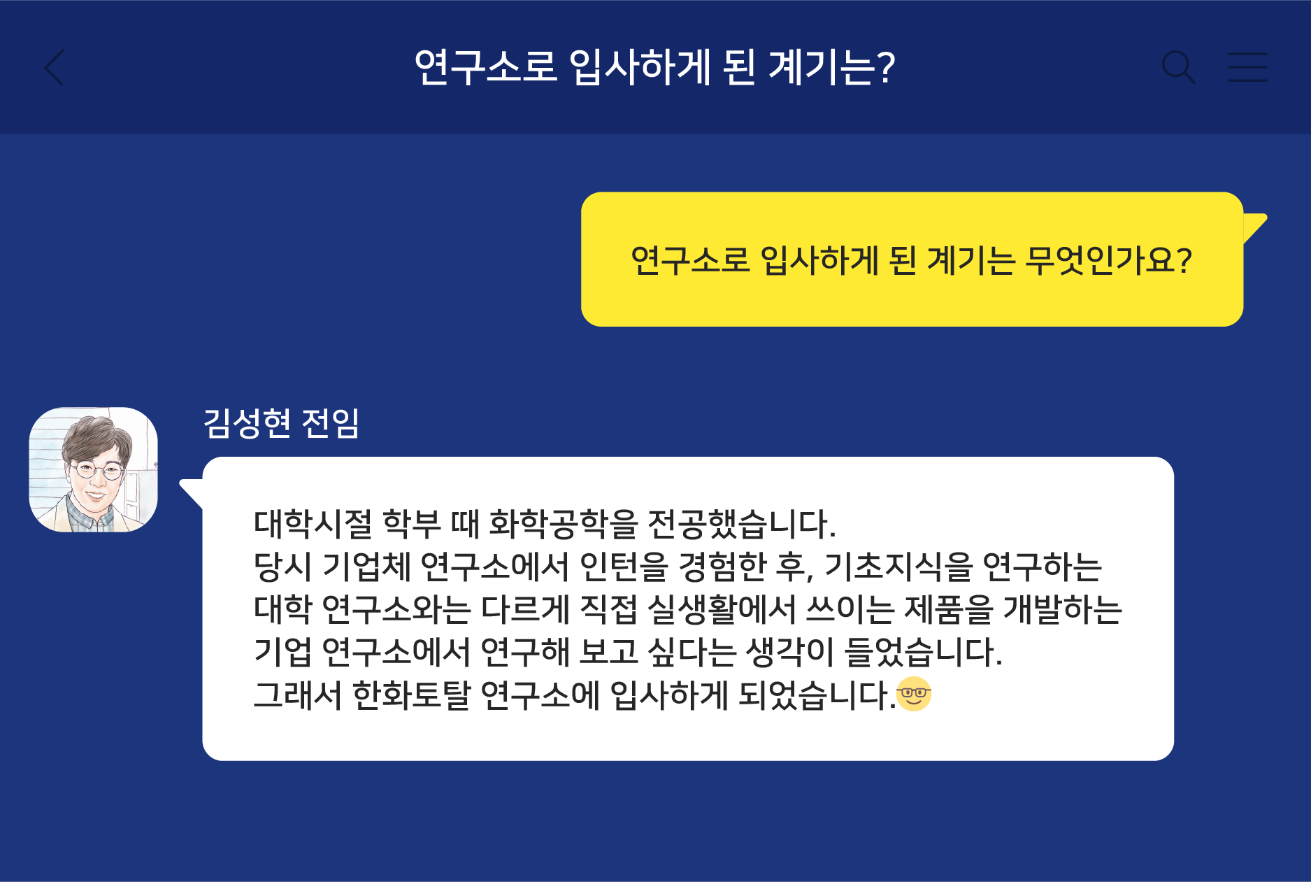 대학시절 학부 때 화학공학을 전공했습니다. 당시 기업체 연구소에서 인턴을 경험한 후, 기초지식을 연구하는 대학 연구소와는 다르게 직접 실생활에서 쓰이는 제품을 개발하는 기업 연구소에서 연구해 보고 싶다는 생각이 들었습니다. 그래서 한화토탈 연구소에 입사하게 되었습니다.