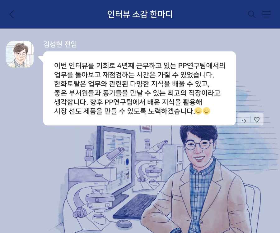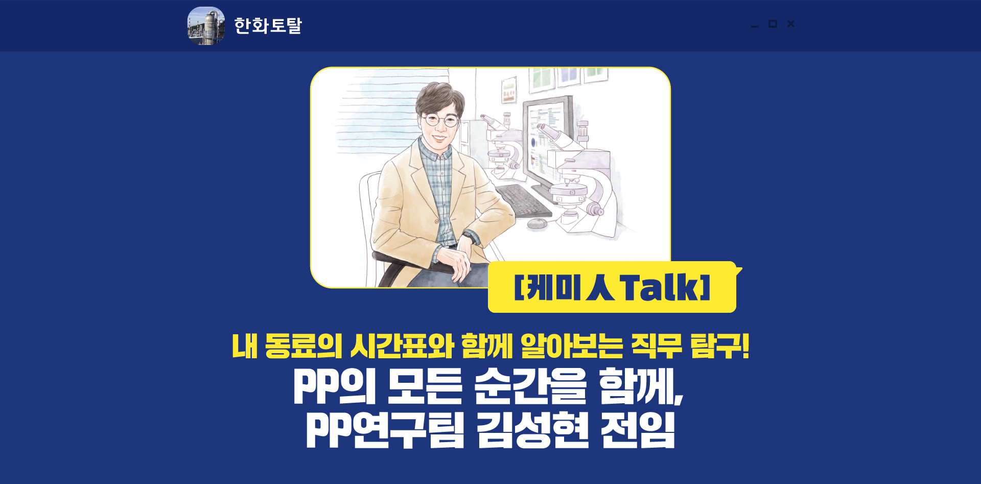 오늘은 한화토탈의 PP신제품 개발을 위해 불철주야로 고민하고 연구하는, 김성현 전임을 만나보았는데요. 김성현 전임의 일과표과 인터뷰를 통해 PP연구팀에 대한 궁금증이 해소된듯 합니다. 그럼, 다음 케미人Talk도 기대해 주세요.