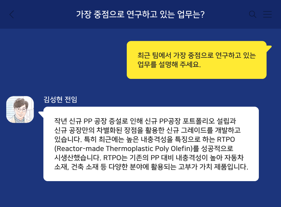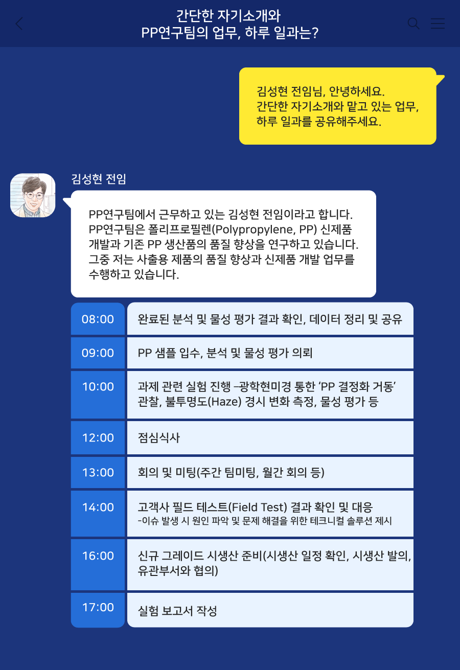 PP연구팀에서 근무하고 있는 김성현 전임이라고 합니다. PP연구팀은 폴리프로필렌(Polypropylene, PP) 신제품 개발과 기존 PP 생산품의 품질 향상을 연구하고 있습니다. 그중 저는 사출용 제품의 품질 향상과 신제품 개발 업무를 수행하고 있습니다.