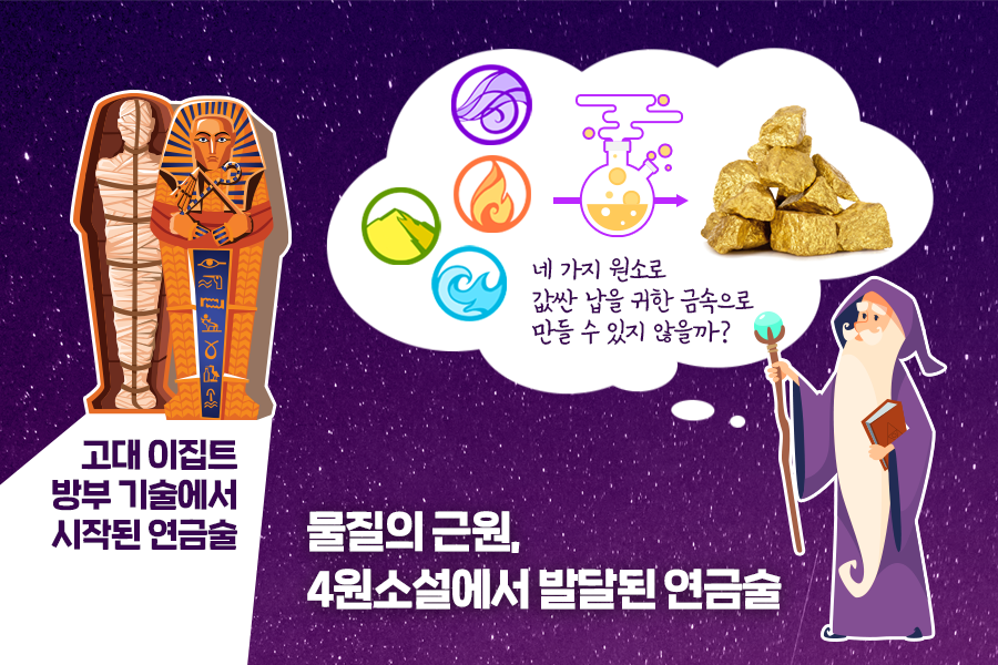 여기서 당대 물질에 관한 설명의 주류였던 4원소설을 기존과는 다른 시각으로 보다 유용하게 활용하고자 하는 사람들이 등장하기 시작했습니다. 이들은 4원소로 대표되는 물질들을 교묘하게 조합하면 모든 물질을 만들어낼 수 있다고 여겼습니다. 그들의 믿음이 ‘연금술’이라는 이름의 독자적인 하나의 연구 영역으로 자리잡게 된 데는 그리 오랜 시간이 걸리지 않았습니다.